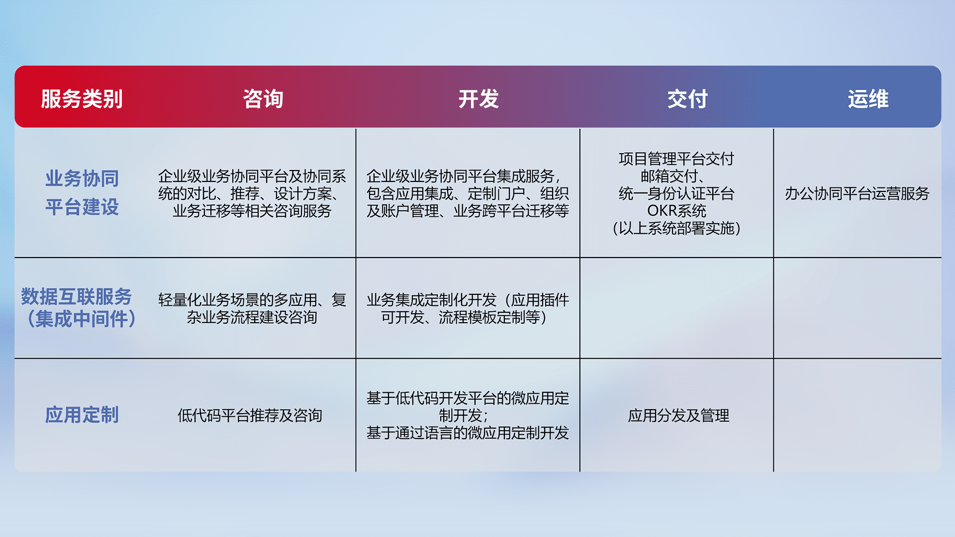 针对钉钉、、、、企微、、、IDaas等平台级产品提供产品的规划、、、、方案、、、交付、、定制化开发等服务,,,,实现如统一协同办公、、、、智能客户服务、、、混合会议管理、、、智能数据查询、、、等业务场景,,,,实现数字化转型。。。。